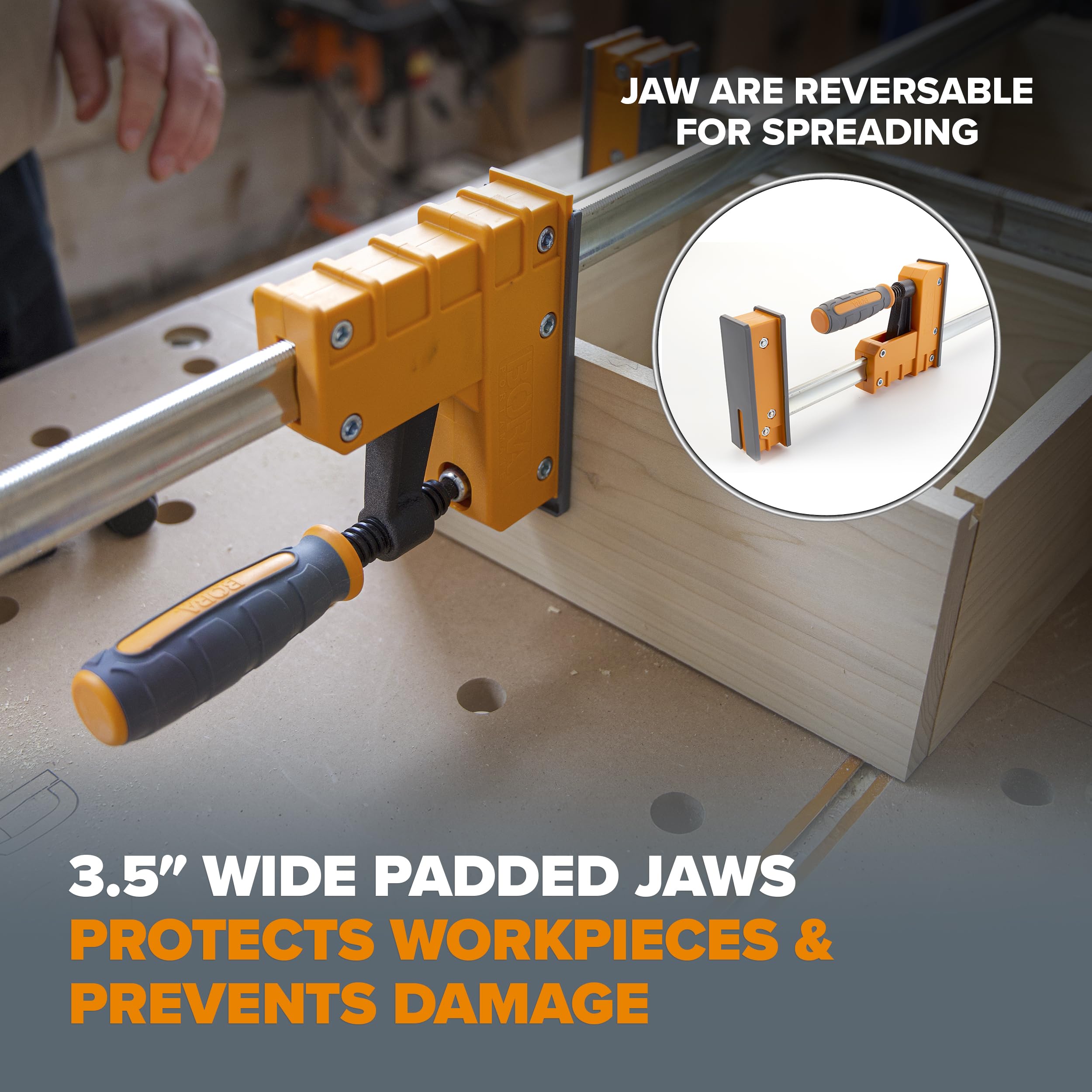 - 3.5 INCH WIDE PADDED JAW - The 3.5-inch wide reversable padded jaw delivers a broad, uniform surface of clamping force to gently but firmly grip or spread your workpiece—no marring or crushing—even when winding tight. The reversable jaw also allows for easy and quick cabinetry work.