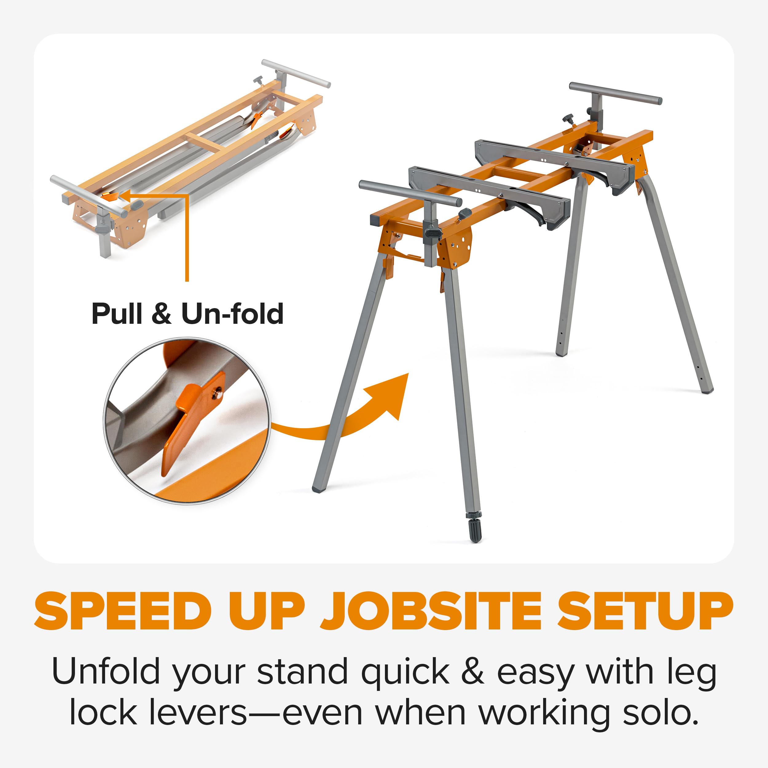 - Workspace Optimization: Compact folding design transforms from portable and compact to full miter saw station in seconds; saves valuable space in workshops, garages, and trucks; perfect saw stand for mobile professionals