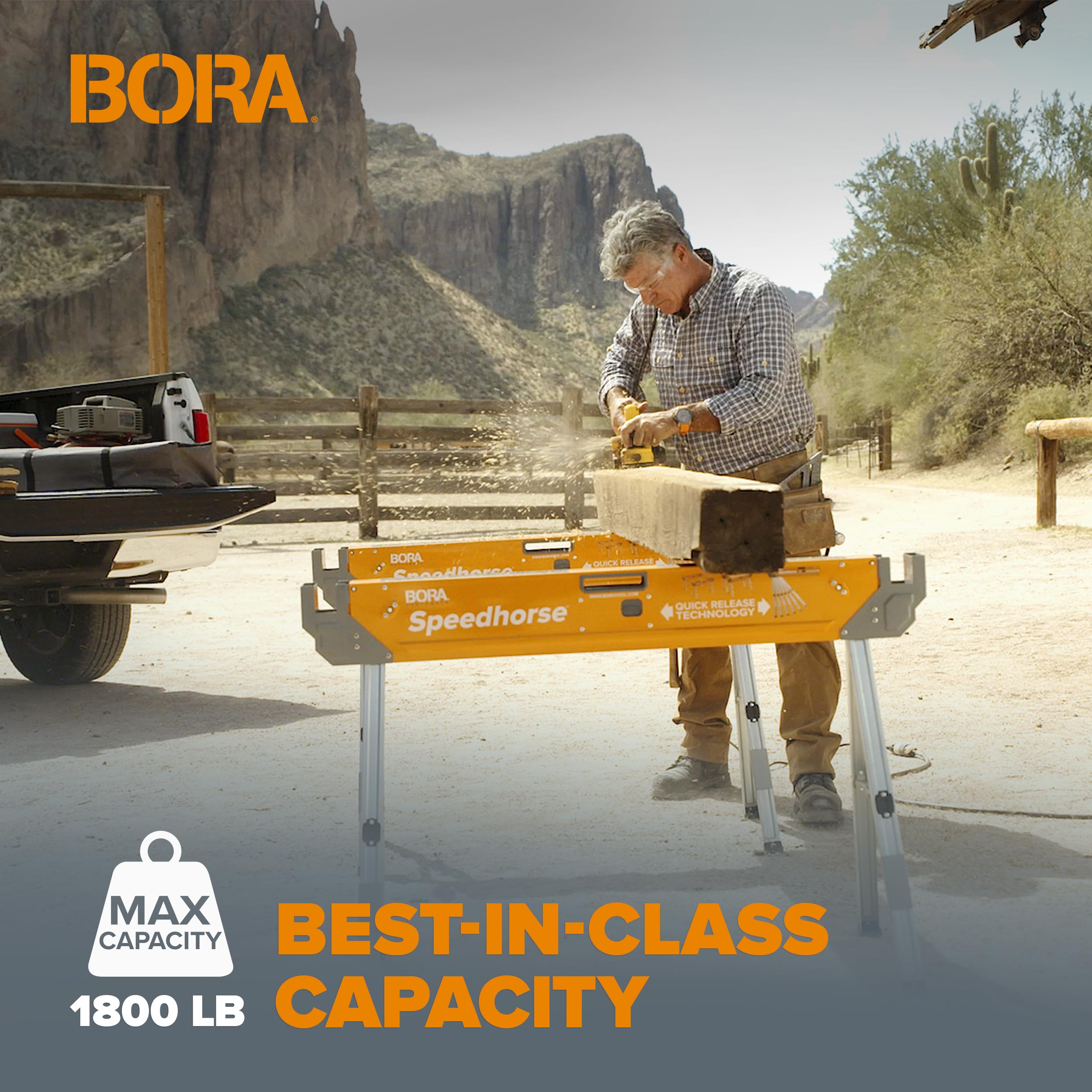 - 1.6 Second Set-Up: The BORA Portamate Speedhorse is the only sawhorse on the market with lever quick-release deploy technology, offering instant setup and teardown that is 30x faster than conventional sawhorses